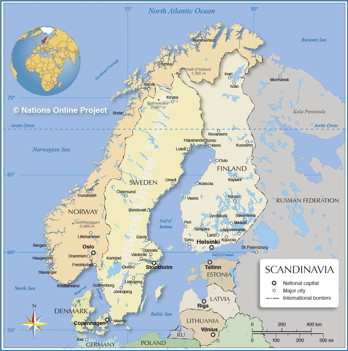 For those unfamiliar with the geography, the main peninsula of Scandinavia holds what is now Norway and Sweden, mainly separated from the mainland of Europe by the Baltic Sea. The Gulf of Bothnia further separates Sweden and Finland, and there is also a bit of present-day Russia on the eastern portion of the overall peninsula. Karelia has had various subdivisions, but generally the area between the Gulf of Finland north and east towards the White Sea, the inlet of the Barents Sea which is surrounded to the north by the Kola peninsula, is considered Karelia. (Thanks to the Nations Online project that makes the map below available for educational purposes.)